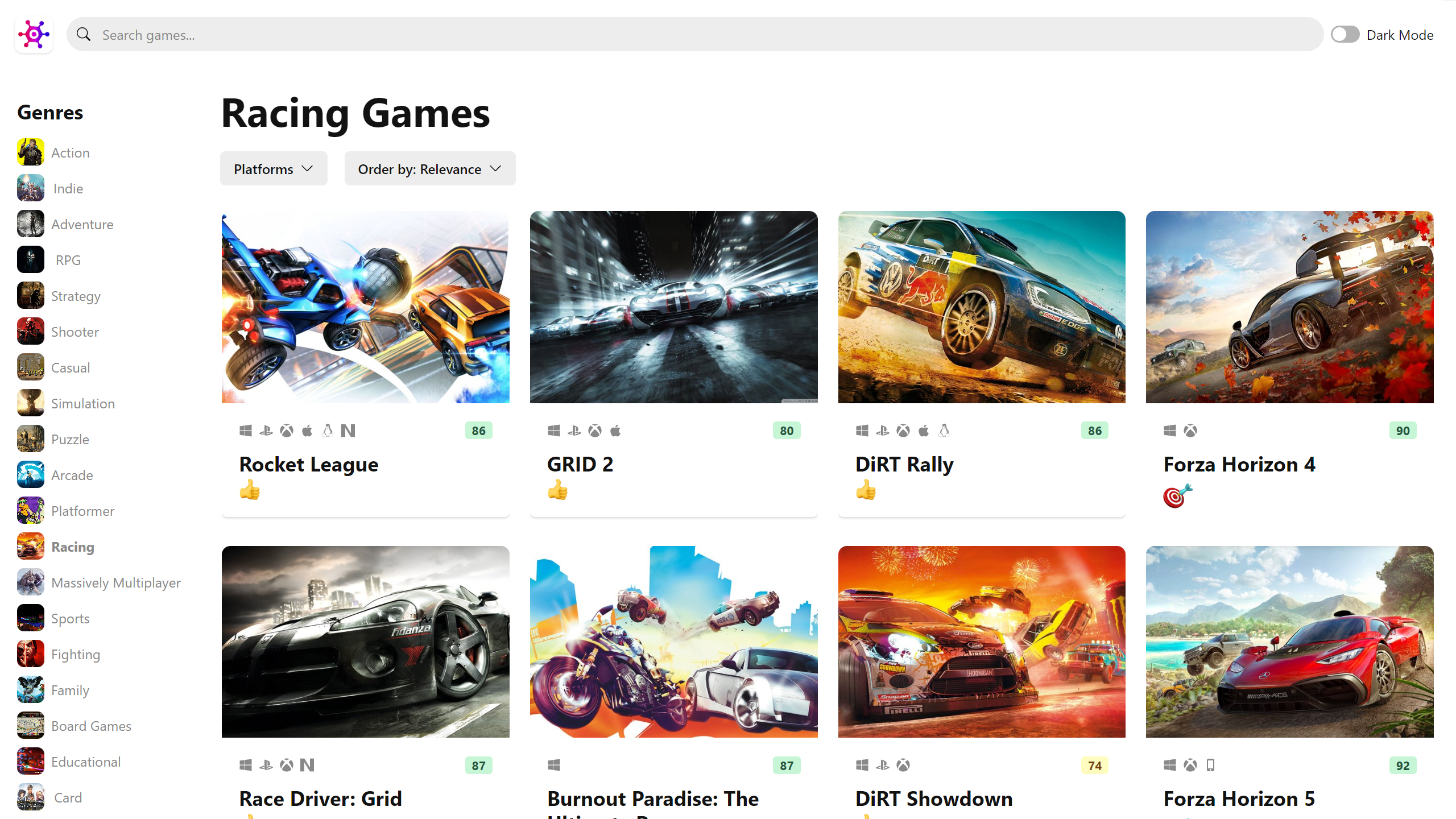 - Each game is a dedicated card. On the card, You can see the rate of the game, full name, platforms that