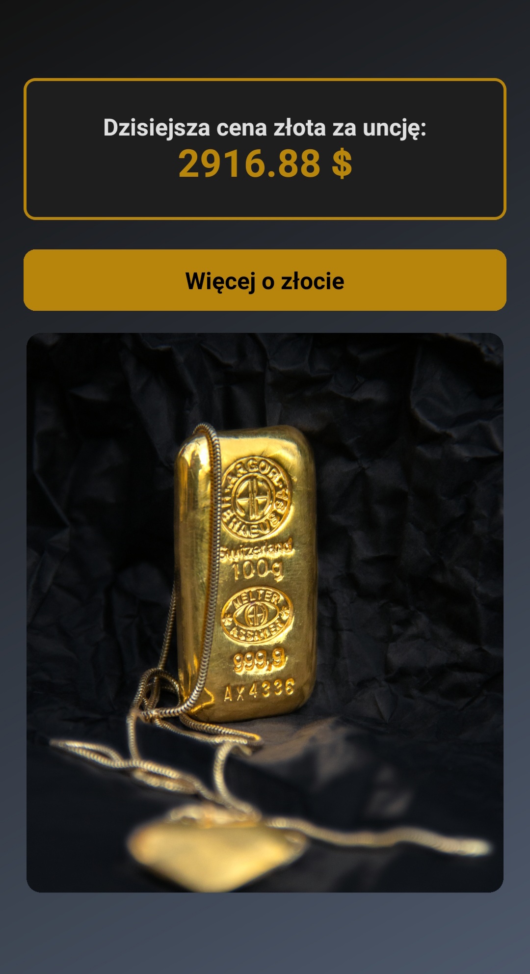 - The app fetches and displays the current price of gold in real-time using the MetalPriceAPI